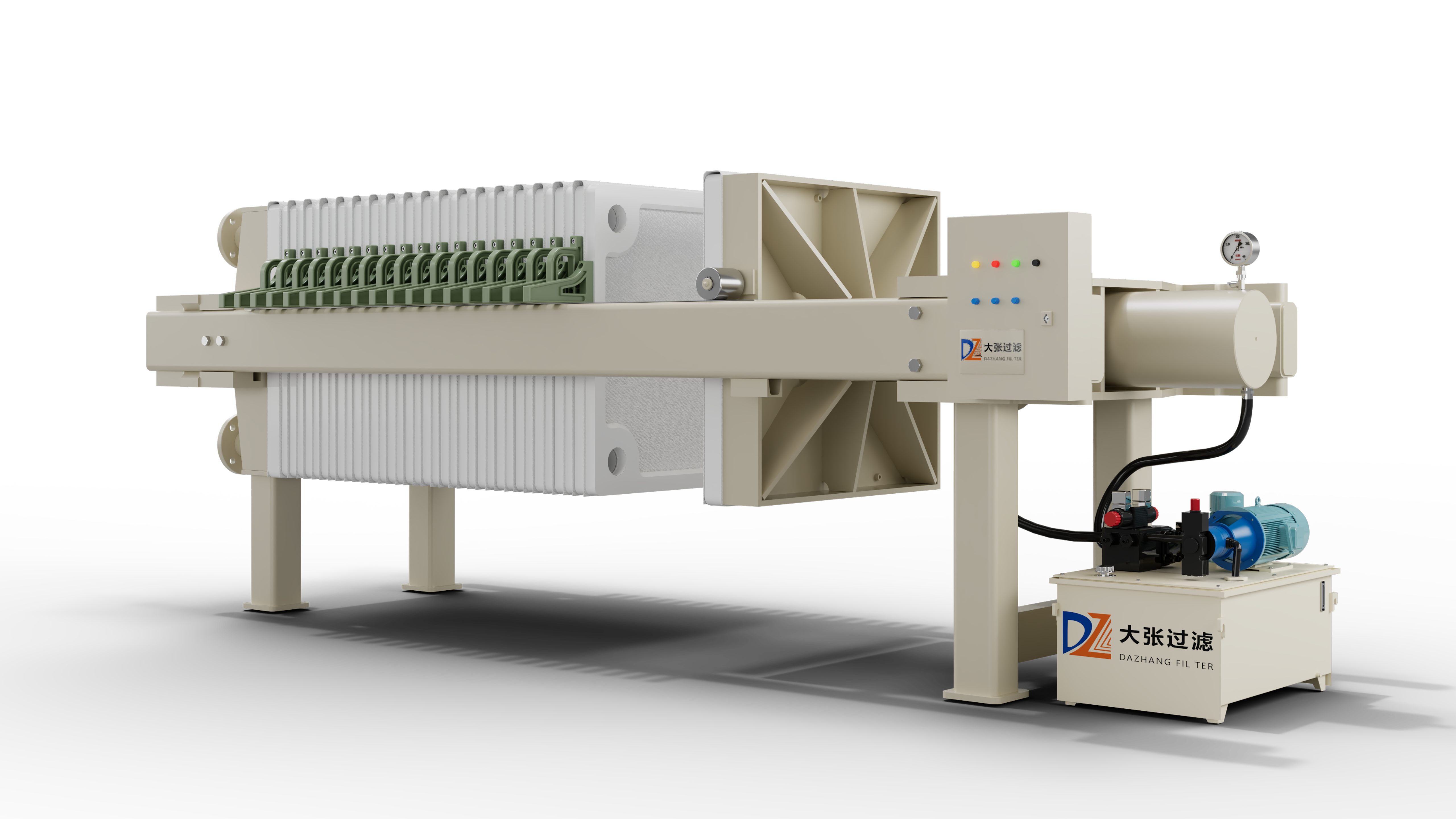 液壓壓緊板框式壓濾機(jī)由主機(jī)(機(jī)架和濾室)、液壓部件和電氣等部分組成。